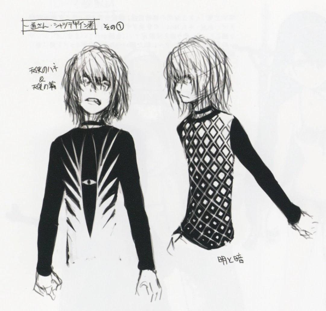 If he's going to do anything official as Board Chairman he'll wear business casual, but otherwise in Etraya he'll go with a monochrome Japanese streetwear style with a lot of geometric and line designs.